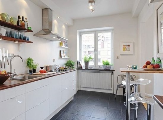 狭长型的厨房一定是很多人的痛,对于这样的厨房,就交给一字型橱柜吧。在角落里设计一个简易的小吧台,特别适合两个人浪漫酌饮。纯净的白色橱柜搭配黑色的地砖,强烈的对比反差形成更大张力,给人更强的视觉冲击。