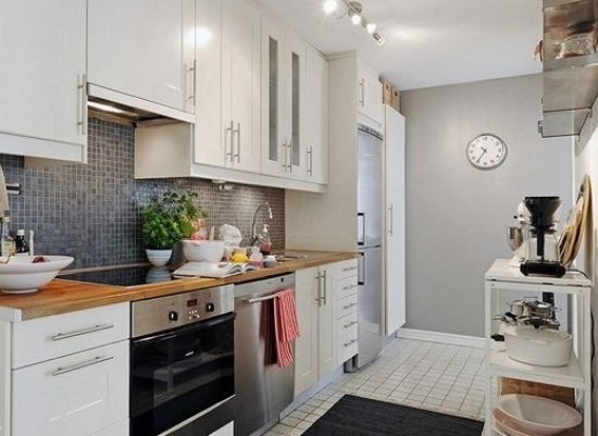 虽然北欧风格很简洁整齐,但会给人一种缺少变化的感觉,而高低有序的吊柜设计则让厨房空间有了层次感。在白色瓷砖铺设的地面上铺一块黑色地毯,形成不错的色彩对比。狭长型的橱柜还真的就比较适合这种一字型橱柜。