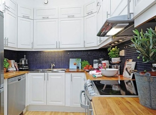 一款白色的整体橱柜,巧妙布局在这样一个小空间中,使它做到“五脏俱全”,美观与实用二者兼得。白色外观在视觉上形成延伸,让厨房空间变“大”。由于天蓝色墙面的点缀,白色橱柜避免了单调苍白。