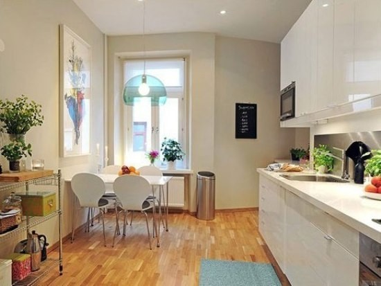 这个厨房有点不太“守规矩”,内部多出了一部分空间,不过放上一个精致的收纳柜或者直接让橱柜延伸出去当作吧台也挺好的。餐桌被安置在了窗边,良好的自然光线加上灯光的点缀,别有一番意味。